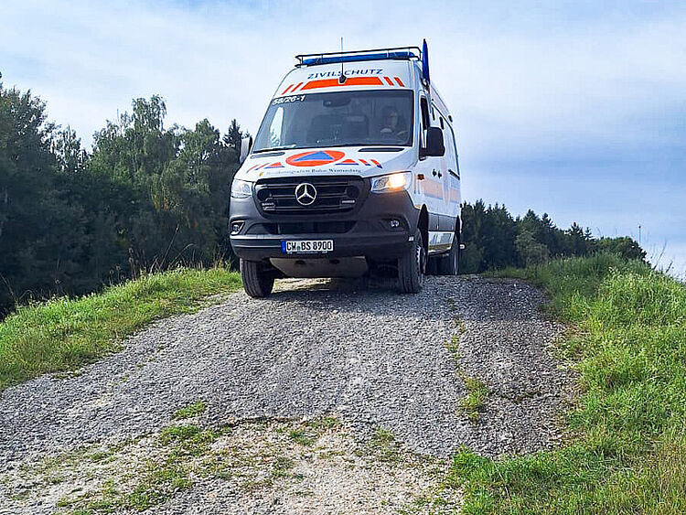 Auch unser Ortsverein war mit dem in Neubulach stationierten Krankentransportwagen Typ B (KTW-B ZS) vertreten. Nach einer kurzen Einsatzbesprechung erfolgte die Marschordnung, und die Einheiten setzten sich im geschlossenen Verband – mit Beflaggung und eingeschalteter blauer Rundumkennleuchte – in Richtung Übungsgebiet in Bewegung.